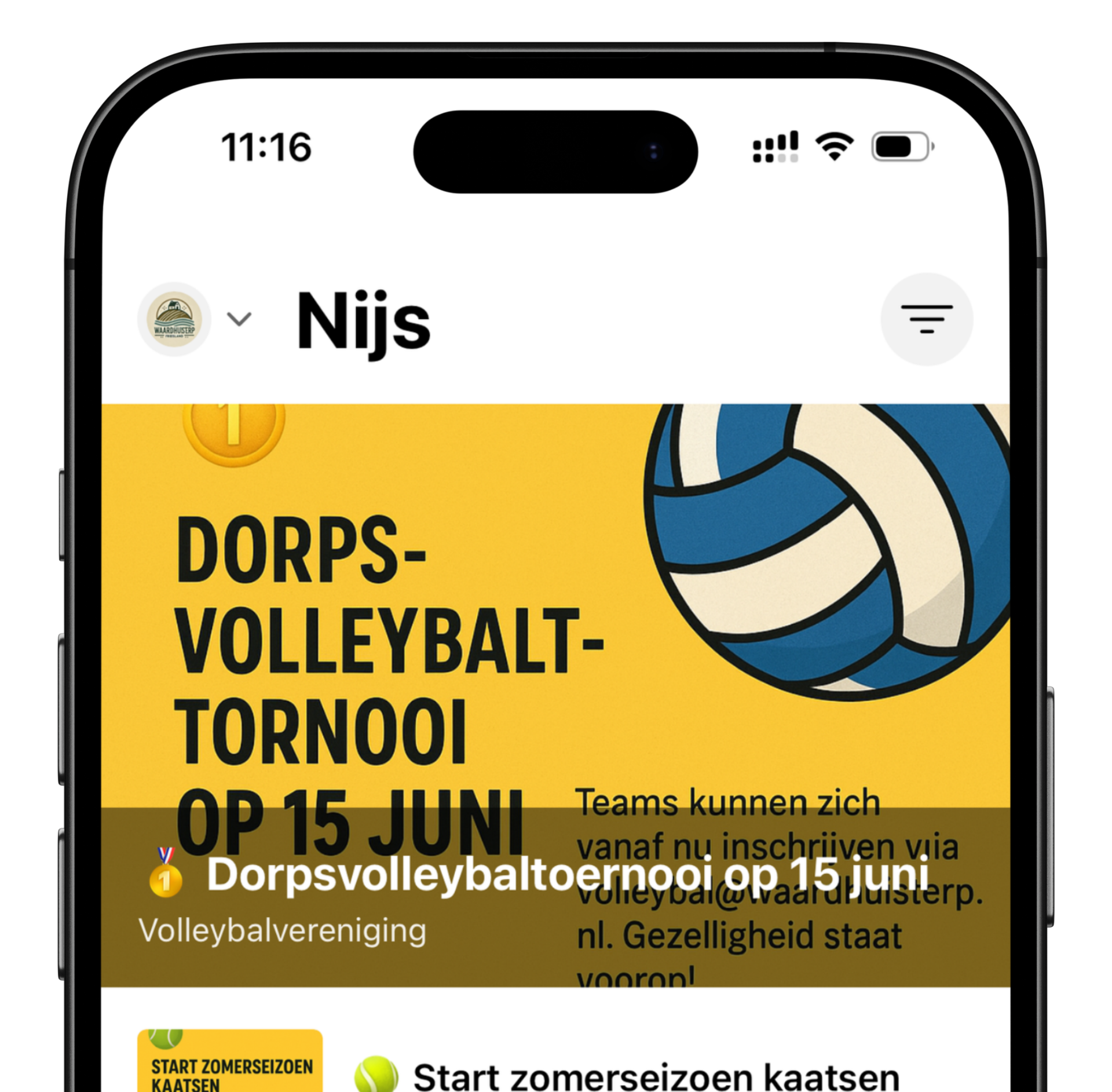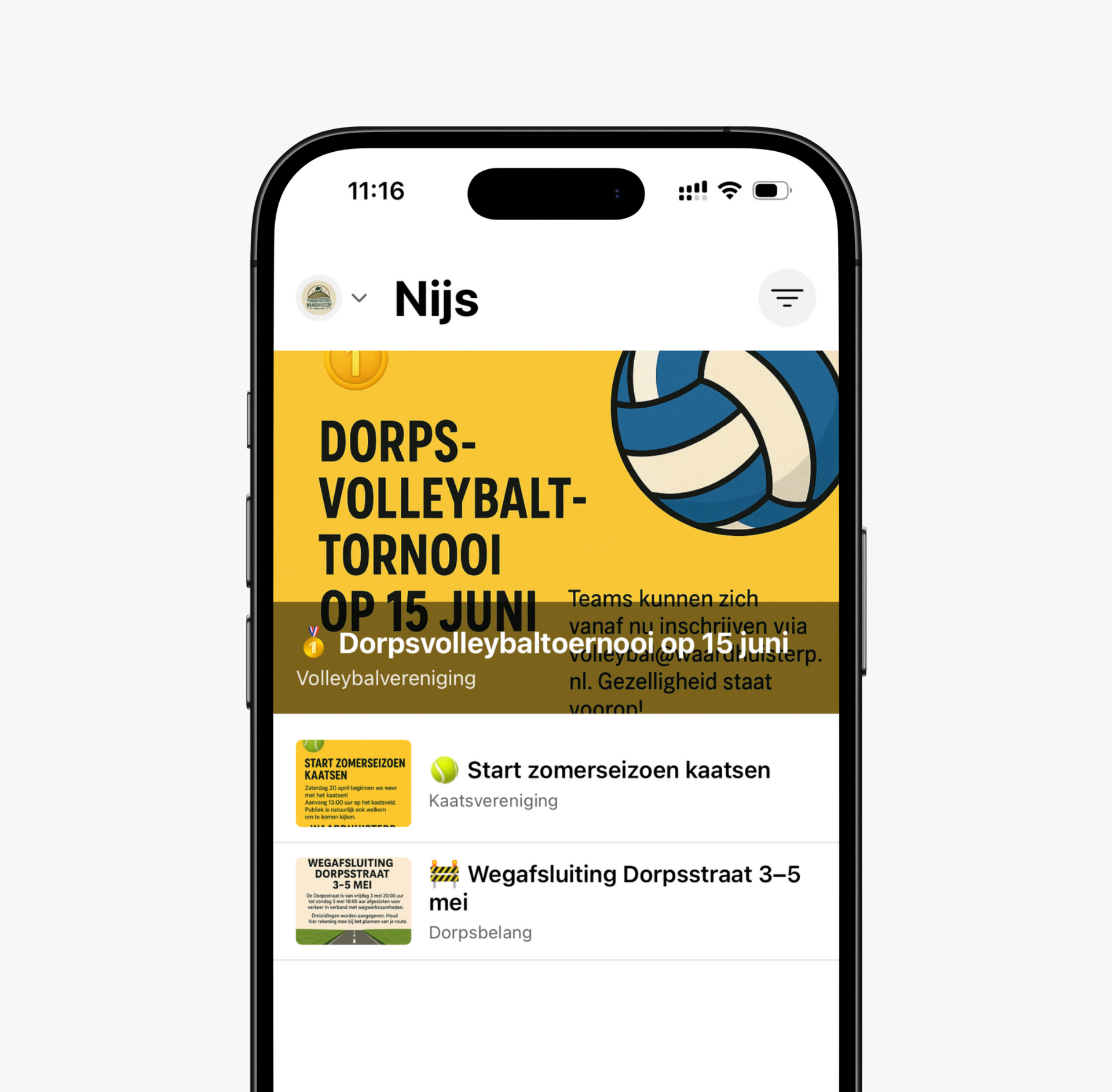 Alle verenigingen en organisaties in het dorp communiceren via hun eigen kanalen en groepen. Met de Dorpsapp brengen we dit op één plek.